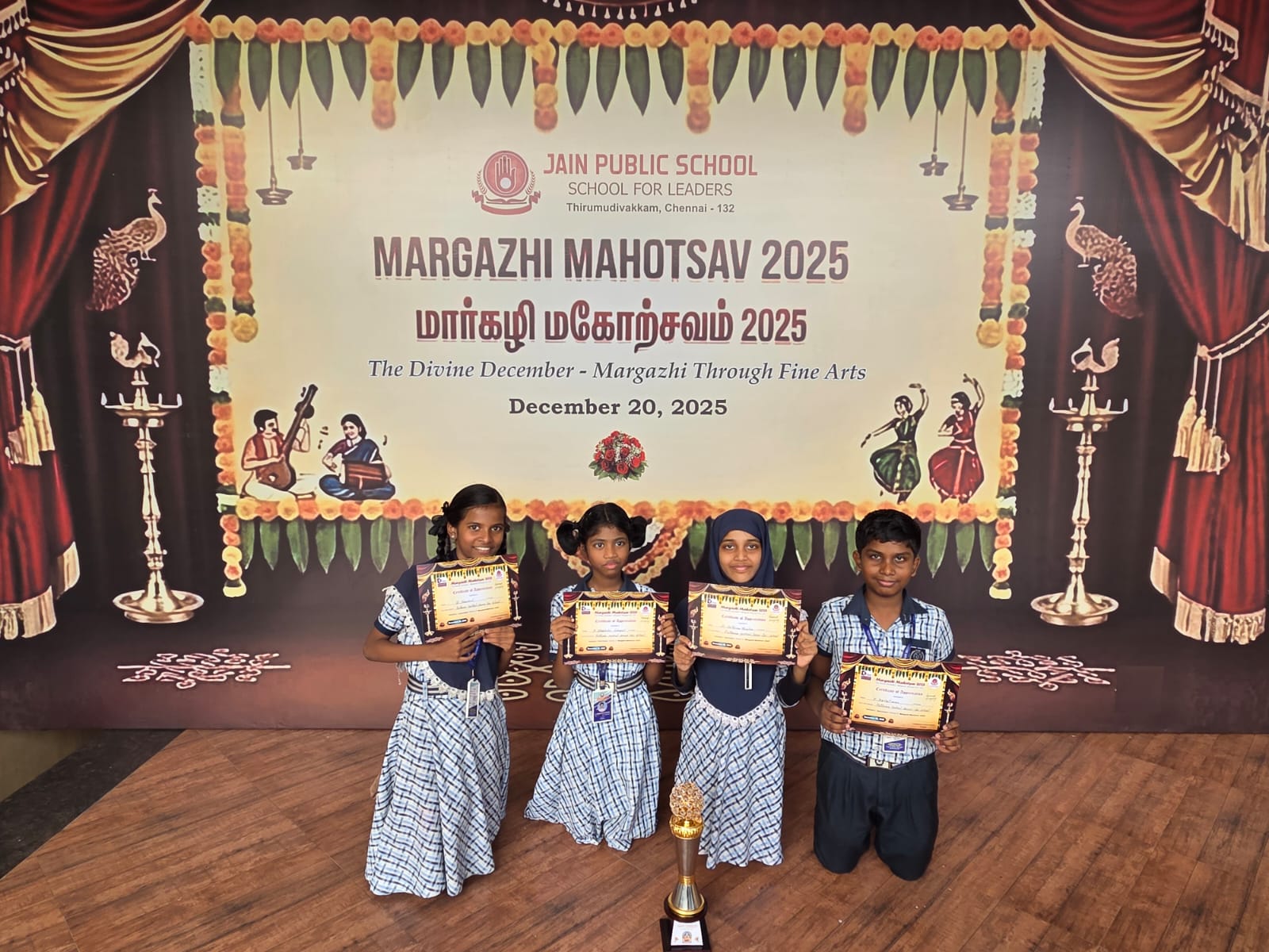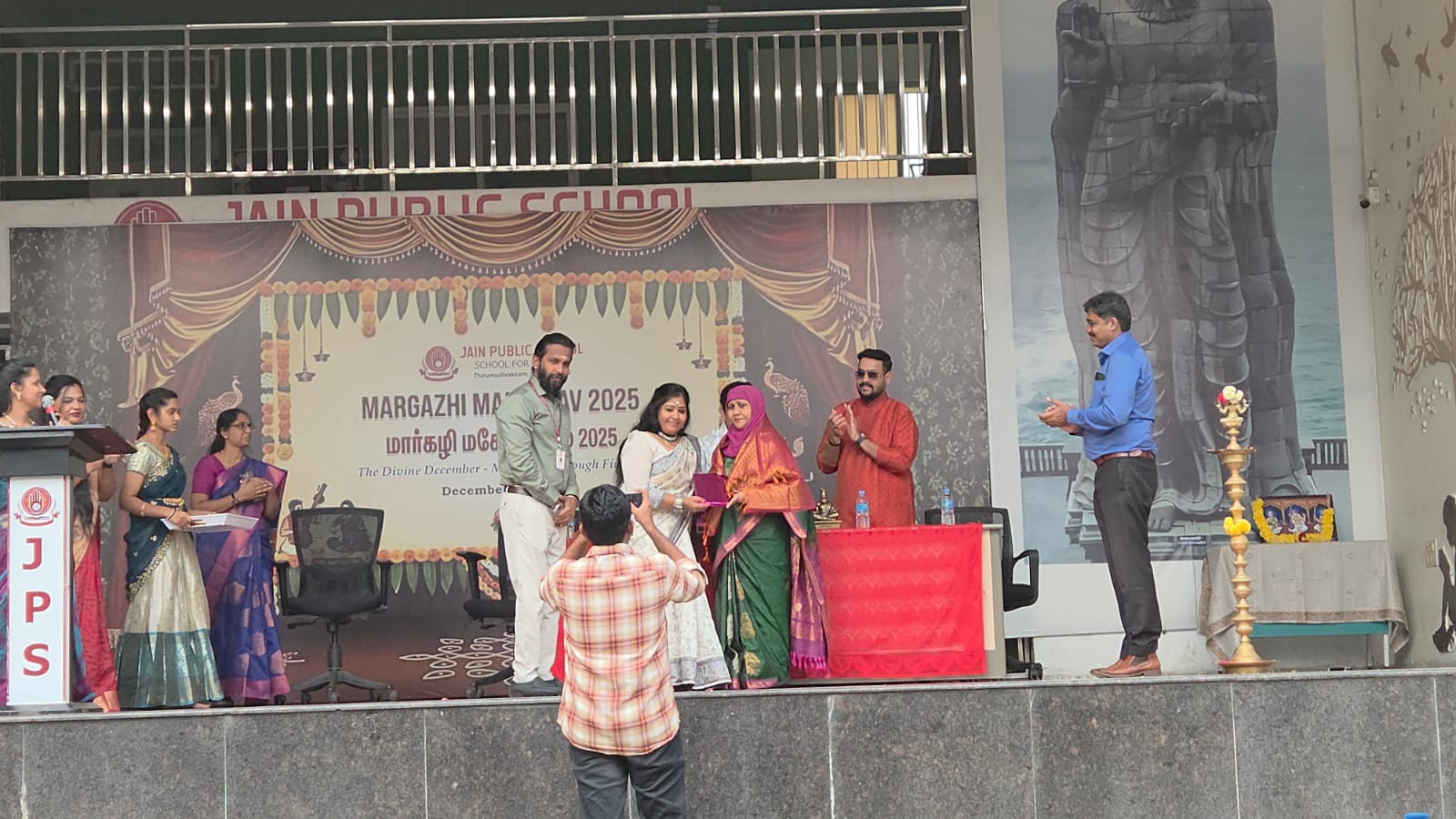 The moment the students who won prizes in the Let's Make Tamil competition received their prizes today from the hands of the Honorable Mr. Anbil Mahesh Poyyamoshi, Minister of Education.